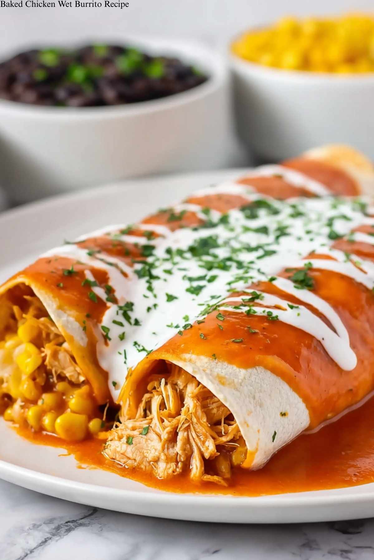 Pair this Baked Chicken Wet Burrito with a side of Mexican street corn salad and a cold glass of horchata for a satisfying and flavorful meal.