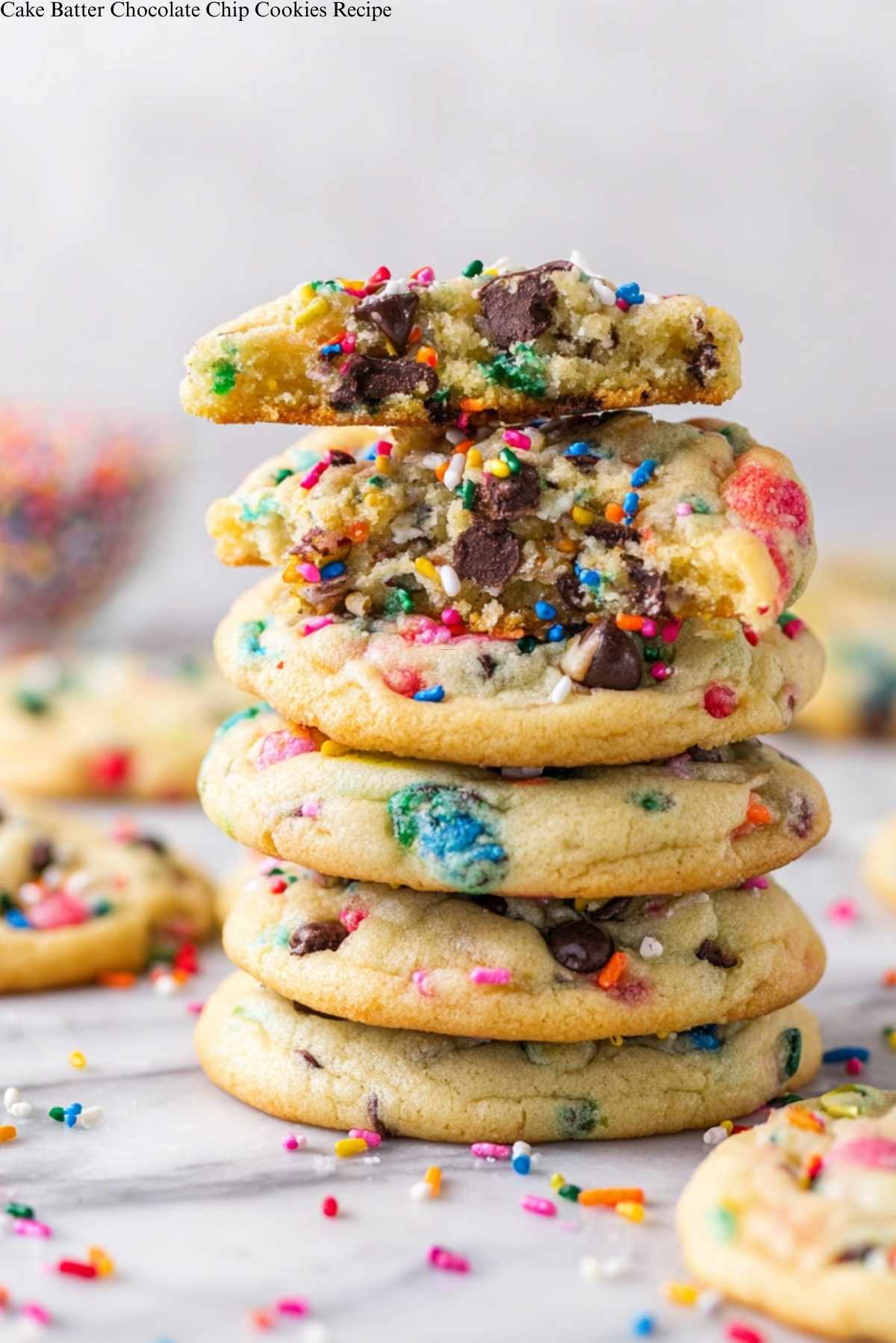 These Cake Batter Chocolate Chip Cookies are soft, chewy, and loaded with a mix of white and semi-sweet chocolate chips and colorful sprinkles. They are perfect for any celebration or just a fun treat!