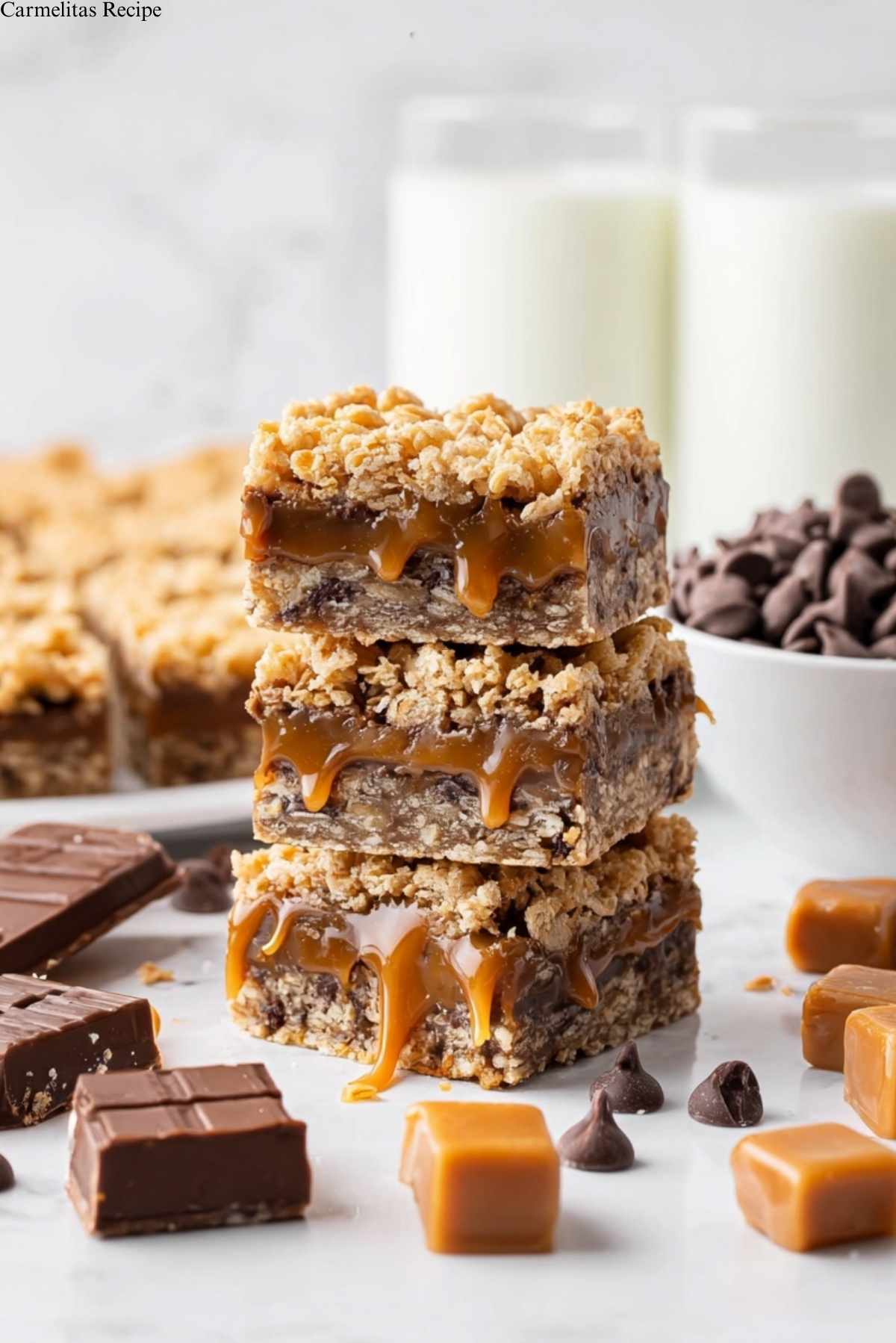 Carmelitas are a decadent dessert featuring layers of buttery oatmeal cookie base, rich milk chocolate chips, and gooey caramel, all baked to perfection.