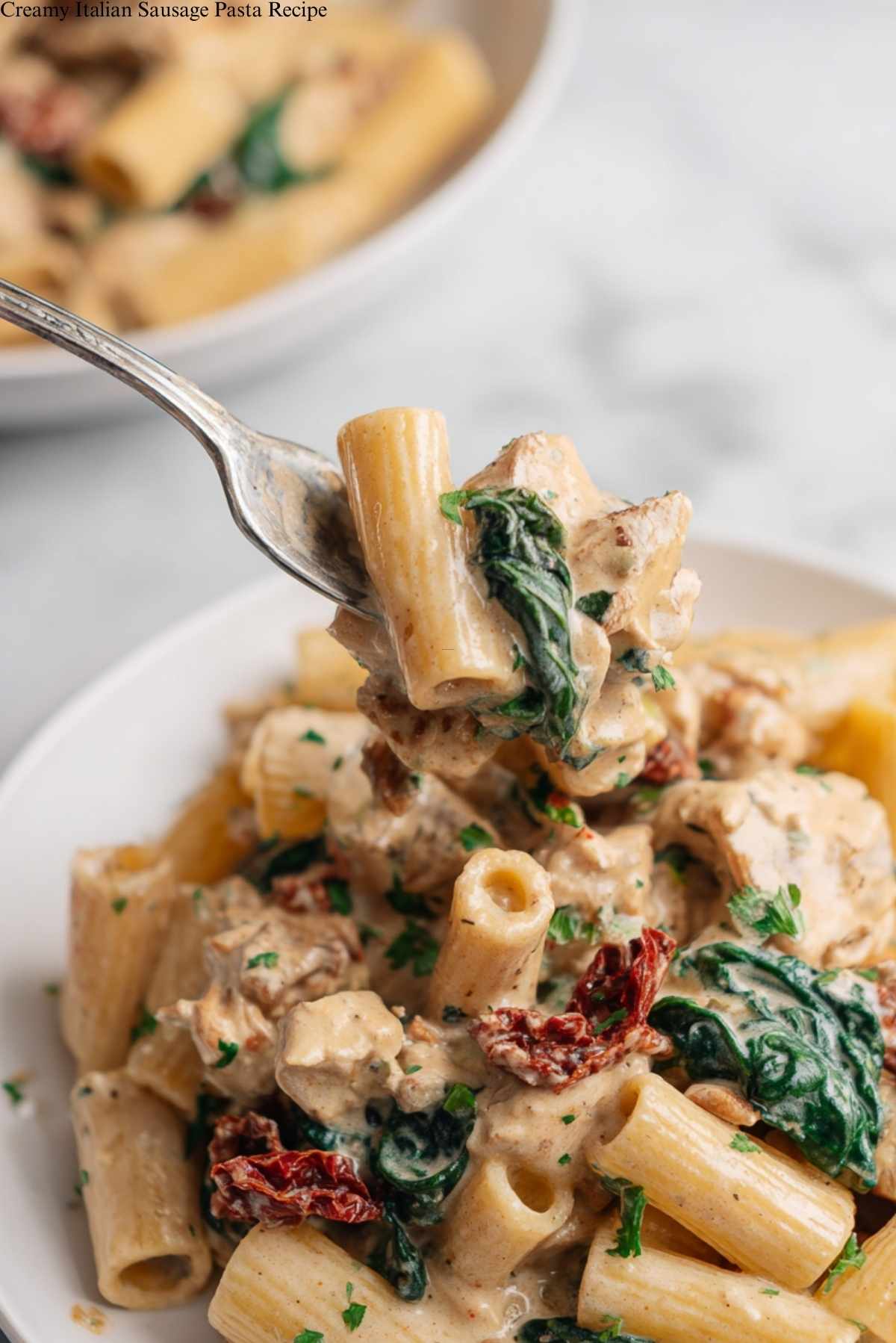 Indulge in a rich and creamy Italian sausage pasta dish that is bursting with flavors from sun-dried tomatoes, spinach, and parmesan cheese. This recipe is perfect for a comforting and satisfying meal.