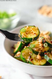 This Asian cucumber salad recipe is a refreshing and flavorful dish with a perfect balance of sweet, tangy, and spicy flavors. The crunchy cucumbers are coated in a delicious dressing and topped with roasted peanuts for an added crunch.