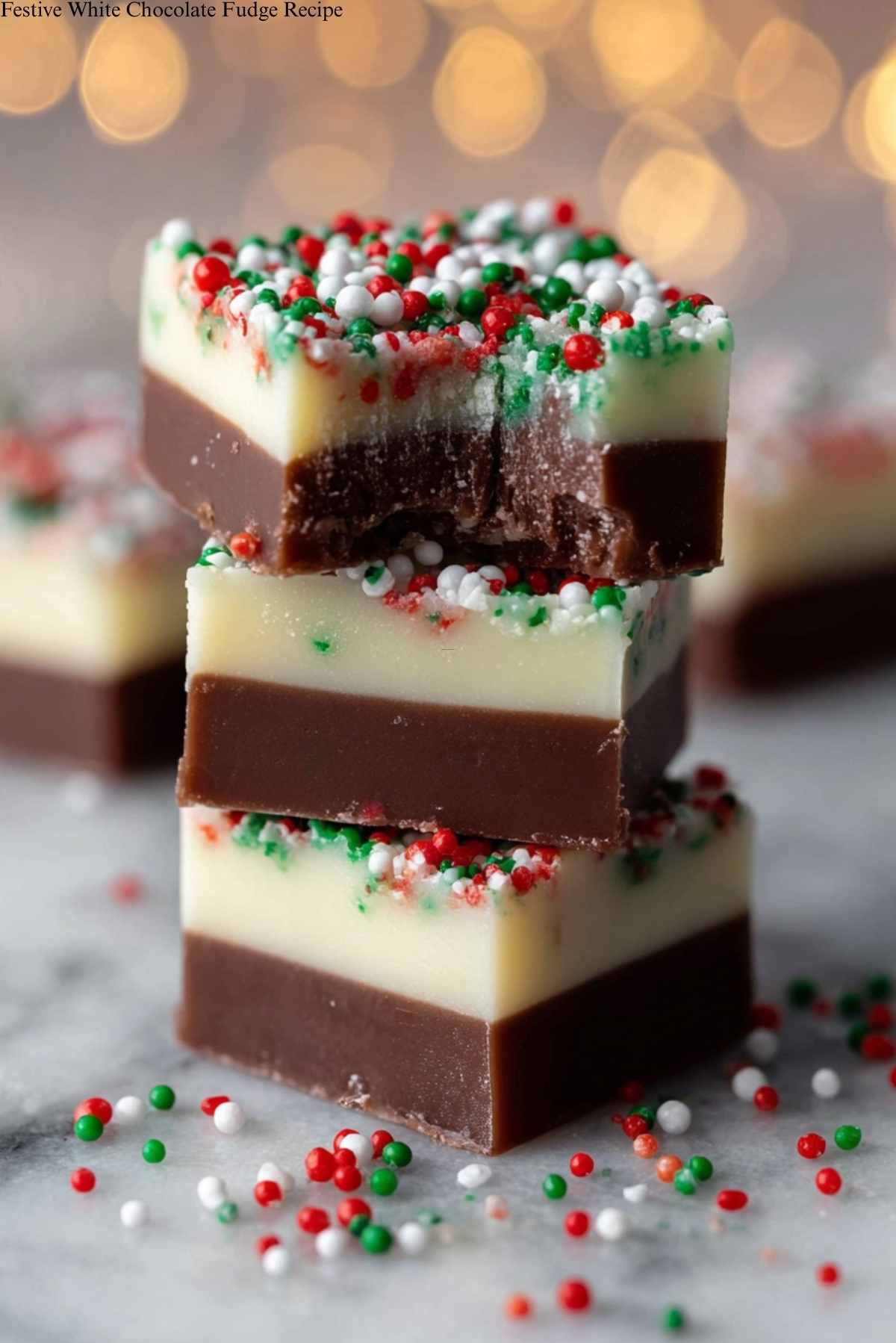 Indulge in the holiday spirit with this Festive White Chocolate Fudge Recipe. Layers of rich semi-sweet and white chocolate are combined with sweetened condensed milk and vanilla extract, topped with Christmas sprinkles for a delightful treat.
