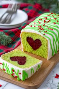 This Green Grinch Cake is a festive and colorful dessert perfect for Christmas. It features layers of red velvet and pistachio cake, topped with a vibrant green icing and heart sprinkles.