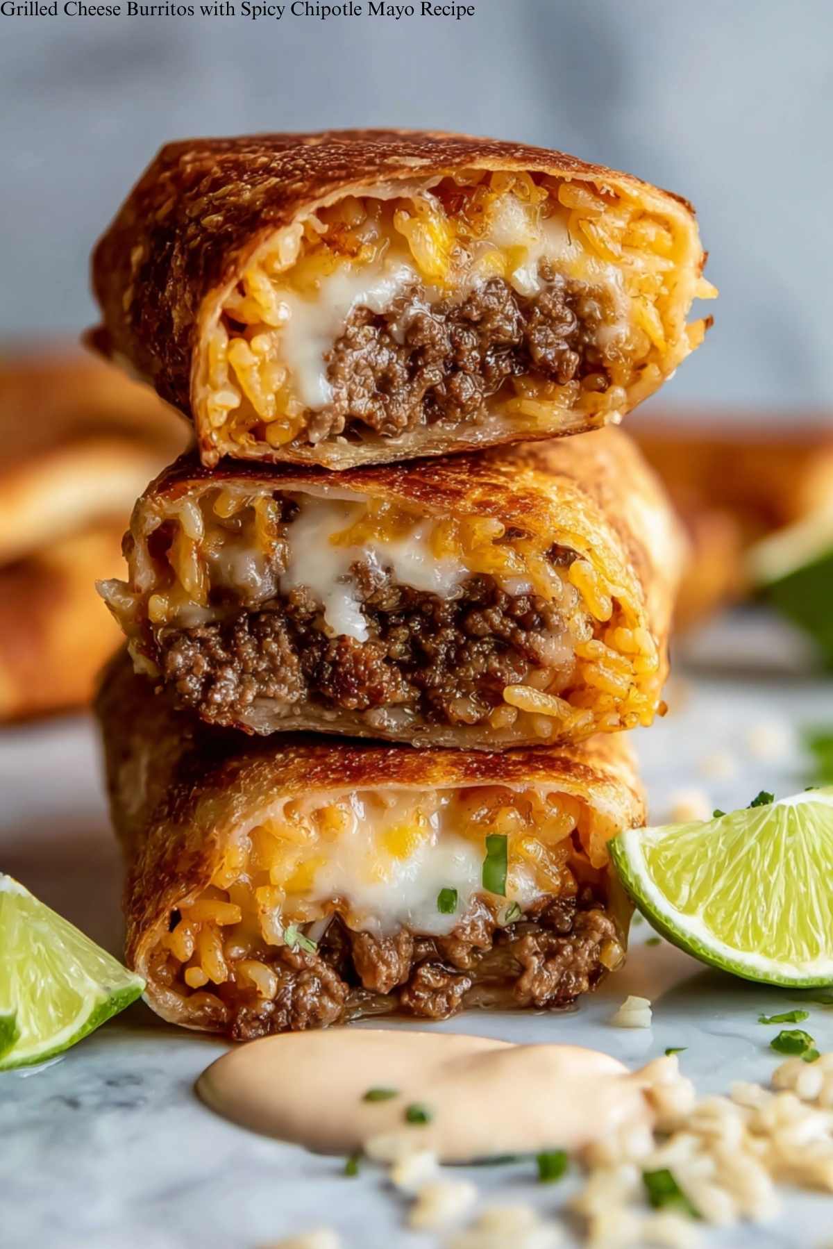 These Grilled Cheese Burritos are a delicious fusion of Mexican and American flavors. Filled with savory taco meat, Mexican rice, and gooey cheese, then grilled to perfection and topped with a spicy chipotle mayo, they are sure to be a crowd-pleaser!