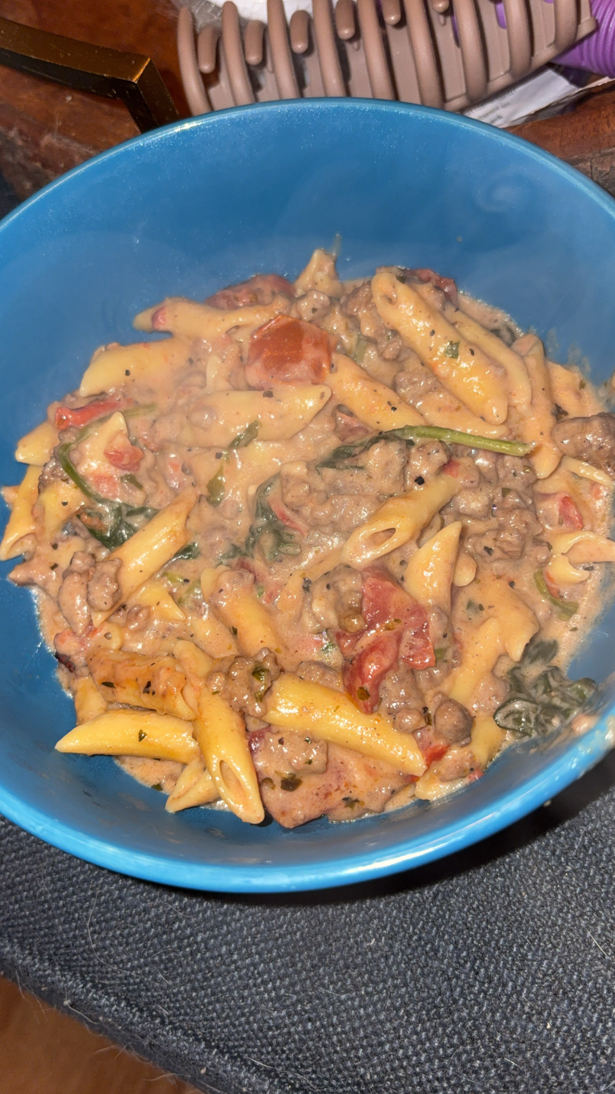 Drain the tomatoes, add some spinach, and cottage cheese, with a little bit of whipping cream and you’ve got yourself a creamy pasta.