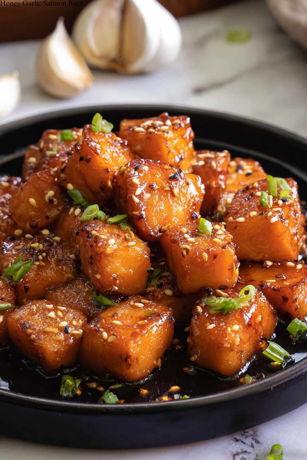 These Honey Garlic Salmon Bites are a perfect combination of sweet and savory flavors. Tender salmon bites are coated in a sticky honey garlic sauce, garnished with green onions and sesame seeds for a delicious appetizer or main course.