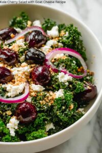 A refreshing and nutritious kale cherry salad with goat cheese, pistachios, and a tangy vinaigrette. This salad is a perfect blend of sweet and savory flavors, making it a delightful side dish or light meal.