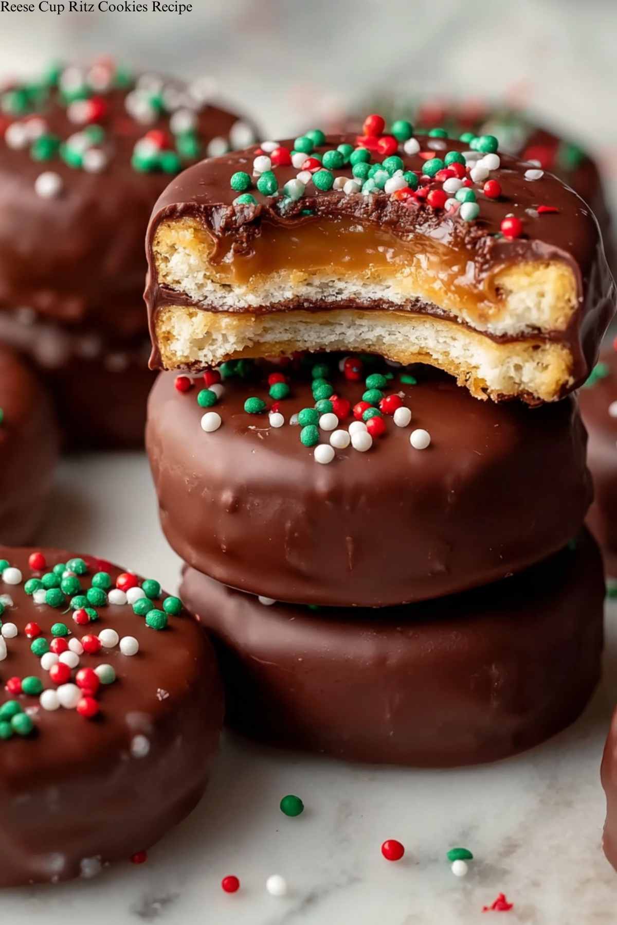 These Reese Cup Ritz Cookies are a delightful combination of sweet and salty flavors. Crunchy Ritz crackers are topped with a Reese Cup Thins and coated in rich chocolate, then finished with festive holiday sprinkles for a fun and tasty treat.