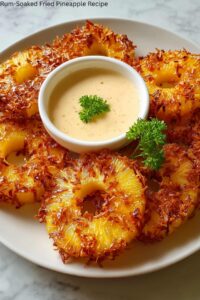 Indulge in these crispy and flavorful rum-soaked fried pineapple rings, coated in sweet coconut flakes and served with a creamy rum-infused dipping sauce.