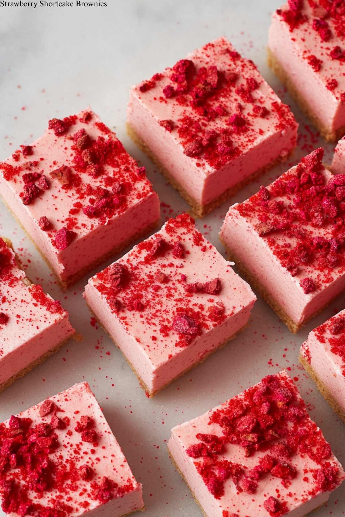 - Assemble: Spread cream cheese frosting over cooled brownies, top with strawberry shortcake crumble. Chill and slice into squares.