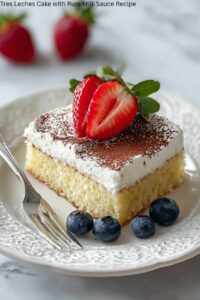 Indulge in this decadent Tres Leches Cake with Rum Milk Sauce Recipe, a moist and flavorful dessert topped with whipped cream, cocoa powder, and fresh berries.